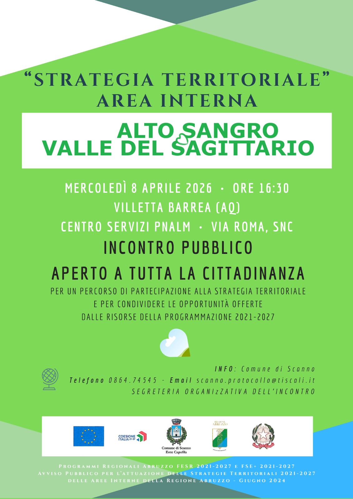 🔊 Si terrà domani, mercoledì 8 aprile 2026 alle ore 16:30, un incontro pubblico dedicato alla presentazione della STRATEGIA TERRITORIALE per l'Area Interna "Alto Sangro e Valle del Sagittario".